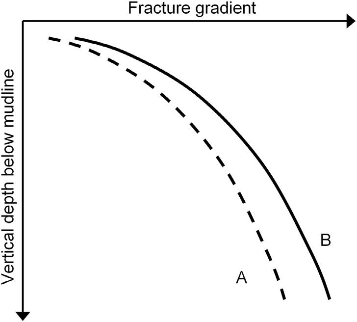 FIGURE1.4 Fracturegradientasafunctionofverticaldepthindeepwaterdrilling:waterdepth incaseAisgreaterthanincaseB.