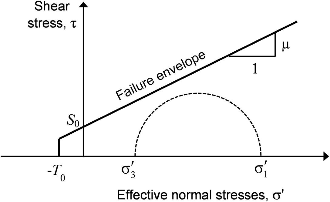 Inpracticalrockmechanicsanalysis,thecurvedfailureenvelopeof Fig.2.4 isoftenapproximatedwithastraightline,asshownin Fig.2.5.The resultingfailurecriterionisknownasthe Mohr Coulombfailurecriterion. Theinterceptofthefailureenvelopewiththe s-axisisknownasthe cohesion, S0.Theslopeofthefailureenvelopeischaracterizedbythe coefficientof internalfriction, m.Thus,theMohr Coulombcriterionhasthreeparameters: S0, m,and T0.