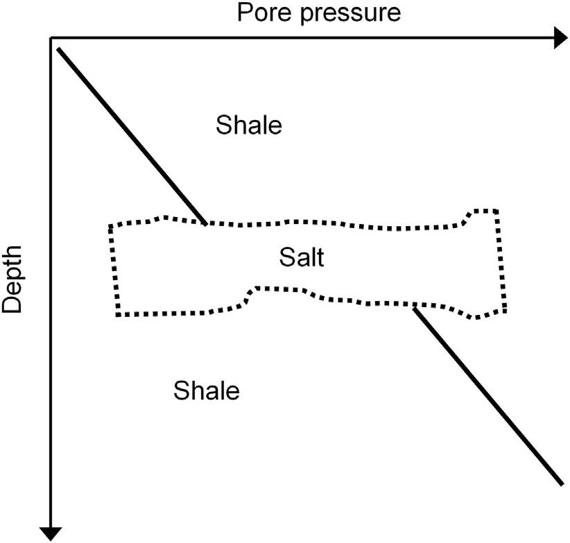 FIGURE1.3 Porepressureprofile(solidline)aboveandbelowasaltbodytypicalofsomeGulf ofMexicowells.Thesaltbodyisshownwitha dottedline.Overpressureinthesubsaltshaleis causedbythesalt“trapping”theporepressure. BasedonSweatmanR,FaulR,BallewC.New solutionsforsubsalt-welllostcirculationandoptimizedprimarycementing.SPEpaper56499 presentedatthe1999SPEannualtechnicalconferenceandexhibitionheldinHouston,Texas; 3 6October1999.