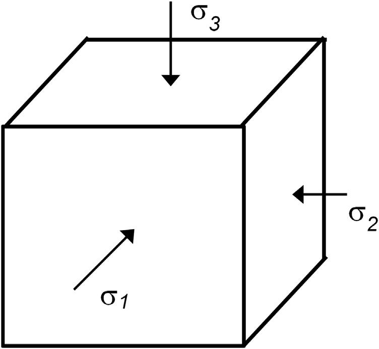 Rotatingthecubein Fig.2.1 would,ingeneral,changethevaluesof normalandshearstresses(exceptinthecaseofauniform,so-called hydrostatic compressionortensioninwhichcasetherearenoshearstresses,andall normalstresseshavethesamemagnitude).Thereexistsonespecialorientation ofthecubesuchthattherearenoshearstressesonitsfaces(Fig.2.2).Normal stressesactingonthecubefacesinthiscasearecalled principalstresses.They aredenotedby s1, s2,and s3,with s1 beingthegreatestofthethree(themost compressiveone)and s3 beingthesmallestofthethree(thetensileorleast compressiveone).Thedirectionsofthesestressesarecalled principalaxes