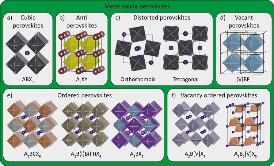 FIG.3 Overviewofvariousmetalhalideperovskites.(A)StandardABX3 cubichalide perovskites,(B)Antiperovskites,(C)Commonorthorhombicandtetragonaldisordered perovskites,(D)VacantBX3 perovskites,(E)Orderedperovskites,(F)Vacancy-ordered perovskites. ReprintedwithpermissionfromQ.A.Akkerman,L.Manna,WhatDefinesaHalide Perovskite?ACSEnergyLett.(2020)604–610. https://doi.org/10.1021/acsenergylett.0c00039.Copyright(2020)AmericanChemicalSociety.