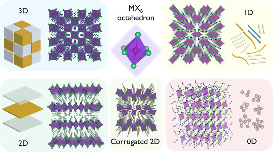 MHPscanbeclassifiedinto3D,quasi-2D,2D,1D,and0Dbasedonthe metalhalideoctahedraconnectivityintheircrystalstructures,asshownin Fig.5[35].Perovskiteswithdimensionalitylowerthan3Dconsistof corner-,edge-,orface-sharingBX6 octahedraandarederivedfromthereference3DABX3 structure.Itisworthnotingthatthedimensionalityhere discussedhasnothingtodowiththenanostructuredmorphologywith spatialconfinementindifferentdirections(e.g.,quantumdots,nanoplatelets/nanorods,nanowires,andnanocubes).