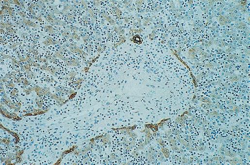 Terminal hepatic arterioles have an internal elastic lamina and a layer of smooth muscle cells, and they open into periportal sinusoids via arteriosinus twigs. Although some mammalian species exhibit hepatic arterioles that penetrate deeply into the parenchyma before entering sinusoids near to the hepatic veins, reports of such penetrating arterioles in humans have been disputed.89 Regardless, isolated parenchymal arterioles may sometimes be seen in liver biopsies. Ekataksin77 has suggested that these vessels supply isolated vascular beds in the parenchyma.