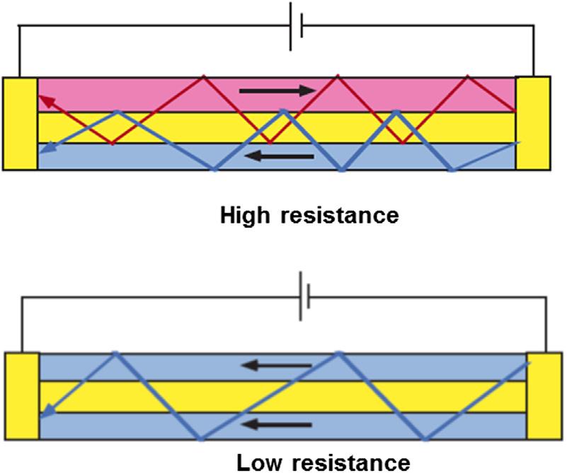 Thebasicactioninaspin-polarizeddeviceisshownin Fig.1 3,whereitisassumedthat theelectronsaretravelingfromanFM,throughanormalmetal,andintoasecondFM. Whenthemagnetizations(or,equivalently,themagneticmoments)ofthetwoFMsareinan alignedstate,theresistanceislow,whereastheresistanceishighintheantialignedstate. Actualdevicesarenotgenerallyfabricatedintheorientationshownin Fig.1 3,because theyaremadefromthinfilmsandtheresistanceperpendiculartotheplaneistoolow.The commonorientation,shownin Fig.1 4,providesmoreusefulresistance,butthephysical pictureofthespin-polarizedtransportismorecomplicated.Theeffectofthespinexclusion inantialignedfilmsisstillobserved,butitresultsinhigh-interfacescatteringand
