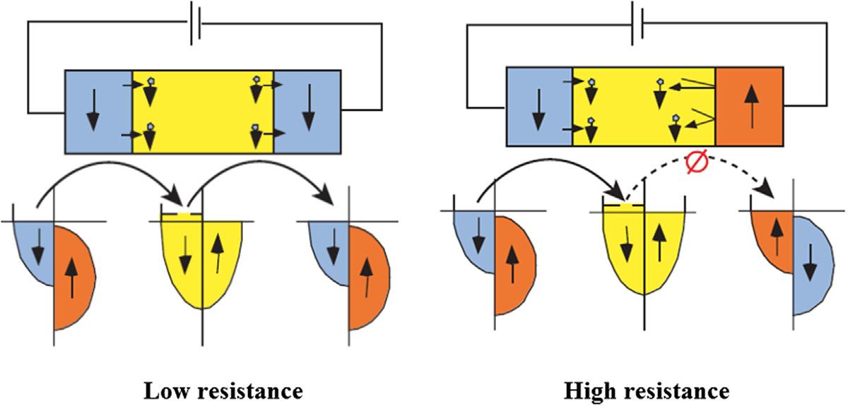 Spintransportandspinrelaxationinsemiconductorsandmetalsareimportantsolid-state physicsissuesthatareincludedinthefundamentalresearchalongwithnewtechnologybeing implementedintheelectronicstoragetechnology.Spintronicshelpedincreatingaprototype devicethatisusedintheindustryasareadhead,andamemory-storagecellisthe giantmagnetoresistive (GMR)sandwichstructure,whichconsistsofalternatingferromagneticand nonmagneticmetallayers.Dependingontherelativeorientationofthemagnetizationsinthe magneticlayers,thedeviceresistancechangesfromsmall(parallelmagnetizations)tolarge (antiparallelmagnetizations).Thischangeinresistance(alsocalledmagnetoresistance)isused tosensechangesinmagneticfields.Electronspincanbeidentifiedasamagneticfieldhaving oneortwopositions,knownas “ up ” and “down”.Thisgivesanextratwobinarystatestothe conventionalhighandlow-logicvalues,which arerepresentedbysimplecurrents.Whenthe spinstateisaddedtothemix,abitcanhavefourpossiblestates,whichcanbecalled “up-high” , “up-low” , “down-high,” and “down-low.” Thesefourstatesrepresentquantumbitsorqubits.