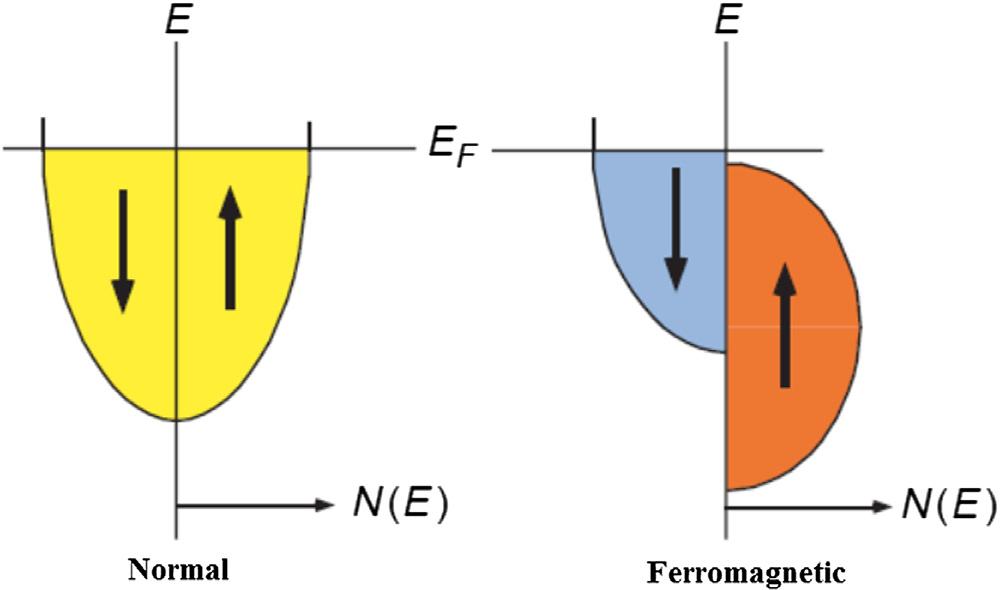 FIGURE1–2 Aschematicrepresentationofthedensityofelectronicstatesthatareavailabletoelectronsina normalmetalandinaferromagneticmetalwhosemajority-spinstatesarecompletelyfilled. E,Theelectron energy; EF,theFermilevel; N(E),densityofstates. CourtesyfromPrinz,G.A.,1998.Magneto-electronics.Science 282,1660 1663.