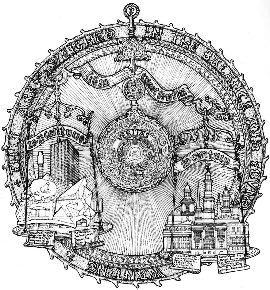 Frontispiece They are Weighed in the Balance and Found Wanting: with respectful apologies to A.W.N. Pugin. An assortment of structures, including an International-Style tower resembling a pile of sandwiches, a tortured piece of Deconstructivism, some Blobism, pilotis, a sub-Corbusian block, and other familiar Modernist elements, is weighed against a selection of Classical works of architecture by John Nash, Robert Smirke, and others, and found unworthy