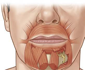 Fig. 1.7 Lower Lip Depressors. Nerve depicted here is the mental nerve, a branch of the third division of the trigeminal nerve. (From Zuker RM, Gur E, Hussain G, Manktelow RT. Facial paralysis. In: Neligan PC, ed. Plastic Surgery: Volume 3: Craniofacial, Head and Neck Surgery and Pediatric Plastic Surgery. 4th ed. Philadelphia: Elsevier; 2018:329-357.e2.)