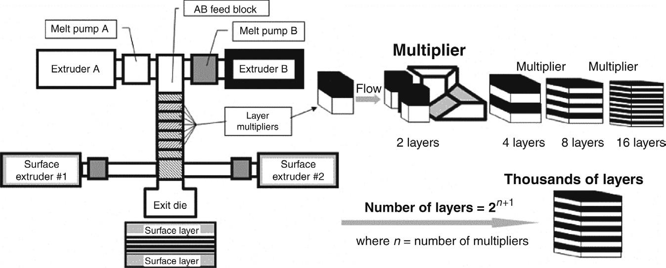 For more than six decades, layered composites have demonstrated their importance in the commercial marketplace. Unlike many earlier technologies, which required multiple manufacturing steps to create multicomponent polymer-layered composites, the coextrusion process produces multilayer films using a single continuous processing step. This advantage reduces manufacturing complexities associated with other processing techniques such as multistep lamination and coating, which require separate handling of individual layers or plies. In contrast, the coextrusion processing allows simultaneous combinations of two or more polymer materials inside a die or feedblock to produce layered structures, thus eliminating the need for any postprocessing or repeated fabrication steps. In 1950s, many thermoplastic film applications were developed with only a few layers. The emergence of an advanced coextrusion processing technique enabling the fabrication of hundreds of thousands of multilayers in coextruded articles has recently led to capabilities and new breakthroughs in material properties and development. The ability to order multiple polymer materials on the micro- or nanometer size scale have led to improvements in many properties and