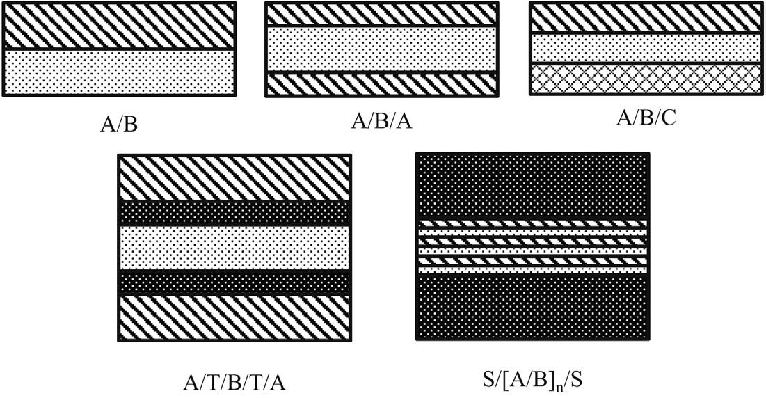 layer sequence of (AB), where A and B represent two different polymers. Nanolayered structures with more than 8000 layers have been produced in a laboratory set-up [11]. The number of layers, the melt feed ratio of the polymers, and the final film thickness can be independently controlled to achieve cost effective, custom product formulations with layer thicknesses in micro- or nanoscale. The process is also very versatile as it allows addition of a third polymer (polymer C), followed by layer-multiplication process to create layered structure with ABC repeating unit. Most often, this third component is added as a tie-layer polymer between polymers A and B to improve their compatibility or adhesion. This type of layer configuration produces a repeating unit of (ATBTA). Another process modification allows adding skin layers after the layer multiplication dies prior to the cast film die. Examples of some commonly produced layered structures are shown schematically in Figure 1.2. The layer structure integrity and thickness uniformity is dependent on the viscosity ratio of the components as discussed in Chapter 2. Advanced work in numerical simulations for velocity counters and flow patterns have been performed and summarized by Dooley [4]. In another approach, Cloeren developed feedblocks to split the melt flow from two polymers into different streams to create layered structures, which are melt laminated together within the feedblock to produce multilayered composites with a few hundred layers using a conventional cast film die [12]