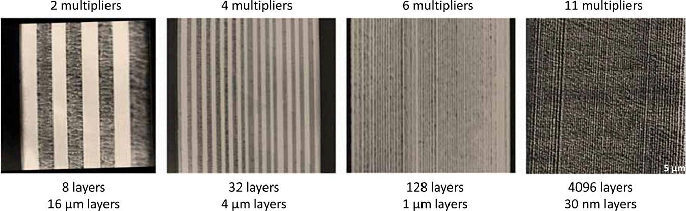 Many multilayered composites showed enhanced mechanical properties with increasing number of layers, even when the relative composition of the polymers was kept constant. For example, in PC/SAN and PC/PMMA layered composites, the deformation mechanism of the SAN and PMMA layers changed from cavitation and craze opening to shear yielding as the layer thickness decreased. PC/SAN composites also showed a 10-fold enhancement in the impact strength as the layer thickness changed from macroscale to microscale [25]. Improved impact properties and fatigue resistance were also observed in these multilayered composites. The fatigue resistance properties can be useful in high-pressure pipe applications. Further investigation of deformation mechanism in nanoconfined PEO lamellae offered insights into deformation of orientated lamellae [26]. Wide range of multilayer film systems with filled polymers, gradient layer thicknesses, and block copolymers have also been investigated. Investigations related to adhesion and