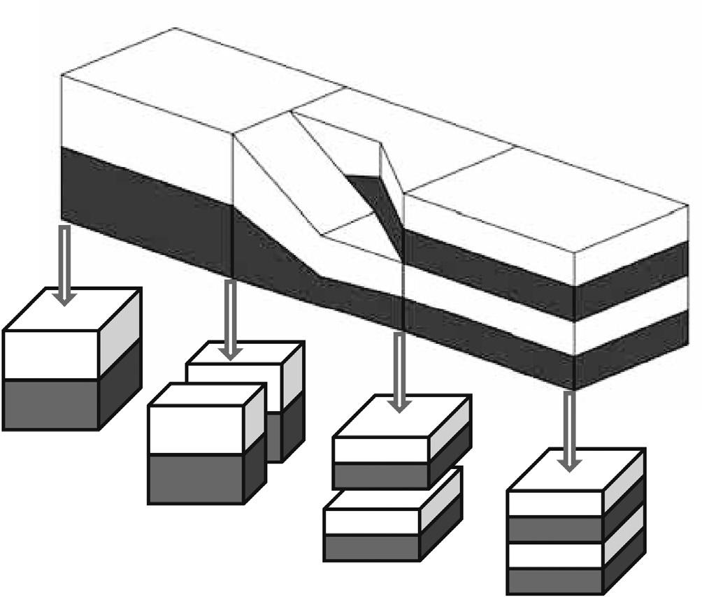 Figure 1.1 Layer multiplication starting with two layers of equal thickness; and the layer pattern produced in different sections of an interfacial surface generator.