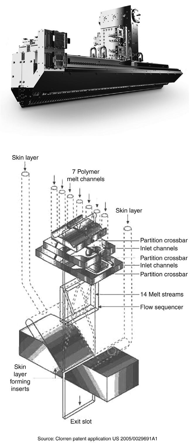 Development of polymer blends and composites rely on the synergistic combination of two or more materials to achieve enhanced properties. Frequently, it is necessary to use blend or composite structures because single polymer components may not meet the end use requirements. The final product properties are strongly dependent on several blend and material parameters including formulation, morphology, processing history, interactions between the components, and other intrinsic properties of the individual components. Structure–property relationships for polymer blends and composites have been reviewed and discussed previously [1] Other approaches such as copolymerization, formulations with processing aids, compatibilizers, impact modifiers, and fillers have been employed to combine the polymers more effectively. One approach to combine the two or more polymers is coextrusion process that combines two or more polymers as a layered structure to achieve wide range of property improvements. Similar to blending, the coextrusion process also relies on achieving synergistic effects by combining polymers at different scales, however, adds an additional structural design freedom that offers control over the size and location of the constituent material domains.