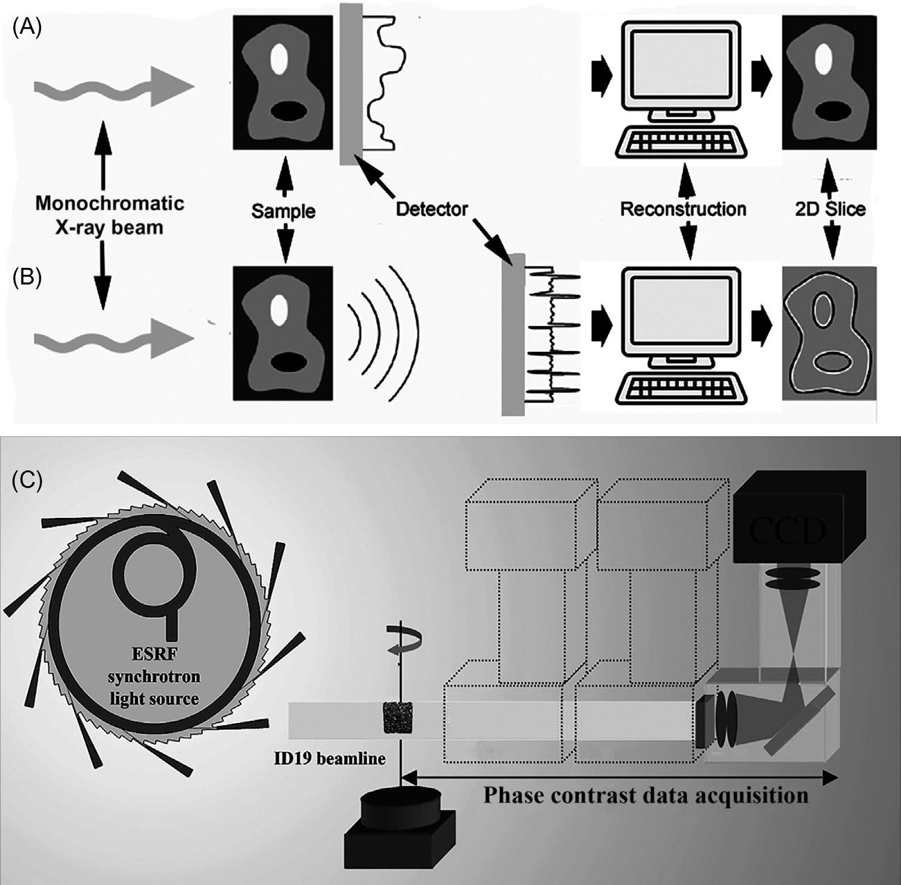 (A)Standard(absorption-based)tomography—Thesampleismountedonatranslationrotationstage(standardSR-microCTsetup).Thedetector(madeupofascintillator,light microscopeoptics,andaCCD)ismountedonatranslationstage.Projectionsare acquiredwiththedetectorclosetothesampleand,afterwards,areprocessedwiththe filteredbackprojectionalgorithmforthereconstructionofthe3Dabsorptionindex.(B) Propagation-basedphase-contrastimaging—Theimagingsourceconsists,alsointhis case,ofmonochromatizedSRX-rays.Thelongsourcetosampledistanceyieldsahigh degreeofspatialcoherence.Thedetector,mountedonatranslationstageatalong distancefromthesample,allowsfreespacepropagationofthebeamafterthesample.In thiscase,theapplicationoftheFBPalgorithmproducesanedge-enhancementeffect, whichisproportionaltotheLaplacianoftherefractiveindex.(C)In-linephasetomography (holotomography),fromRef.(Giulianietal.,2013)—Thetomographicacquisitionis performedwiththedetectordistances(D1, D2, , Dn)fromthesample.Foreachrotation angle,aphaseretrievalalgorithmisappliedtoprojectionsacquiredateachdistance, providingthephasemaps,inturn,arethenprocessedwiththeFBPalgorithmtorecover the3Drefractiveindexdecrement.