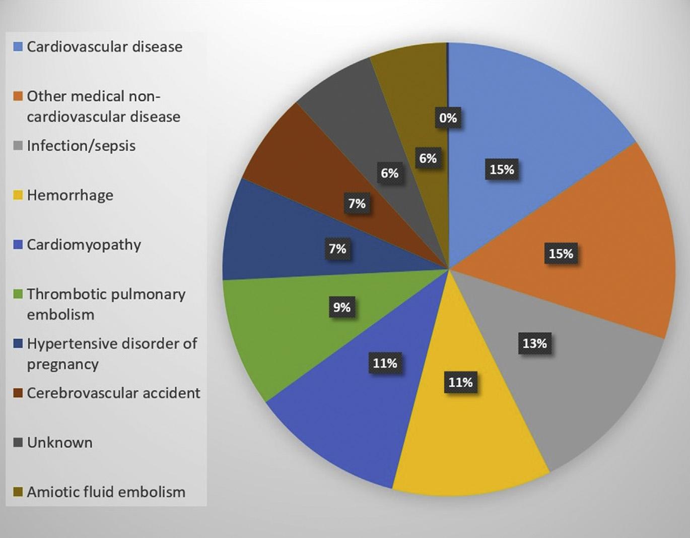 corroboratethisshiftincauseofdeathandlistthetop3causesintheUnitedStates from2011to2013ascardiovasculardisease(15.5%),othermedicalnoncardiovasculardisease(14.5%),andinfection/sepsis(12.7%).Hemorrhageisstilllisted amongthetopcauses,rankingasthefourthleadingcauseat11.4%of pregnancy-relateddeathsduringthistime(Fig.1)16 Multiplestudiesconducted overasimilarperioddemonstrateacorollarytrendinincreasedincidenceofchronic heartdisease,17 hypertensivedisorders,18 obesity,19 anddiabetes,20 amongpregnantwomenofferingadditionalinsightintothechangingtrendsinmaternalmortality intheUnitedStates.RacialdisparitiesinmaternalmortalitypersistintheUnited Statesaswell.15