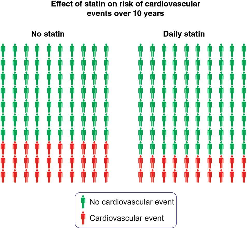 Figure 1.3 Patient decision aid to communicate the benefit of a statin on cardiovascular risk. This hypothetical decision aid could be used to demonstrate how taking a statin might reduce the likely number of cardiovascular events over a 10-year period from 30 to 20 per 100 people.