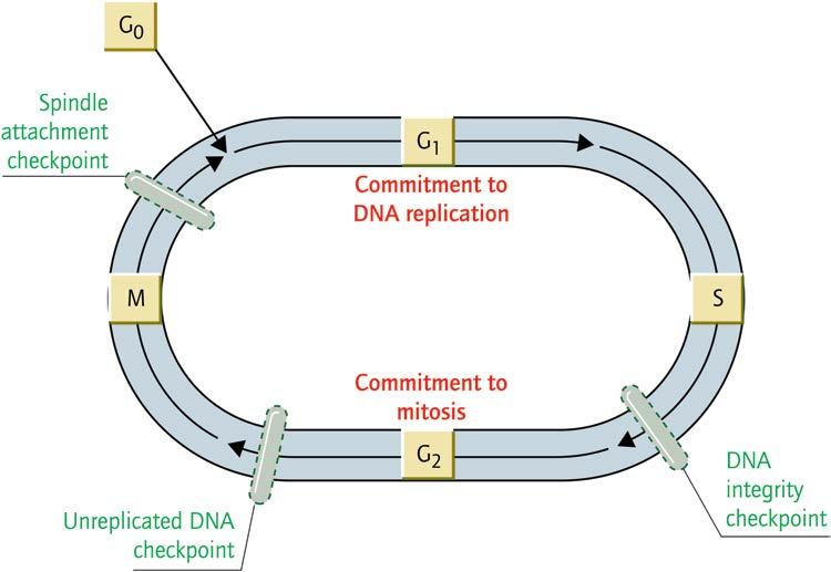 Figure 2.6 The cell cycle. Cells resting between divisions are held indefinitely in the quiescent (G 0) phase. Upon appropriate stimulation (e.g. exposure to growth factors) cells enter ‘gap 1’ (G1), the first stage of the cell cycle, during which various RNAs and proteins are synthesized. The cell then enters a period of DNA synthesis termed the ‘S-phase’. Once each chromosome has been replicated, a second ‘gap’ phase, G 2 takes place. When the cell is ready to divide, mitosis begins (M phase). During mitosis, chromosomes condense and the nuclear envelope breaks down, allowing paired chromosomes to attach to centrioles by a microtubule spindle. Chromosome pairs separate and are moved to opposite ends of the cell preceding cytoplasmic division (cytokinesis). Positive and negative control points operate throughout the cell cycle. Various commitment points and regulatory checkpoints are marked in red and green, respectively. Cell cycle control proteins include p21, p53 and Rb (the retinoblastoma protein).