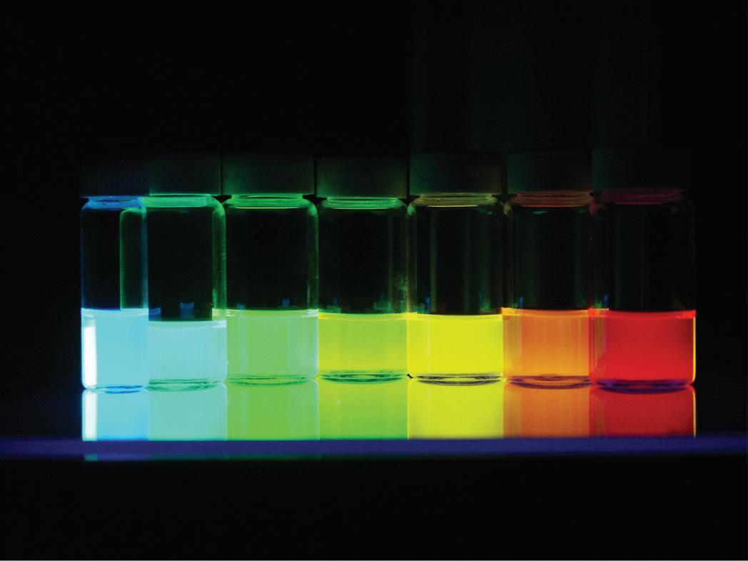 FIGURE 1.1 (c) Light emission under UV irradiation of CdSe nanoparticles dispersed in hexane. The particle size varies from 1.5 nm (blue) to 7 nm (red) (courtesy of B. Dubertret, ESPCI, Paris, France).