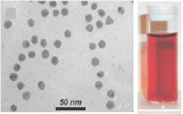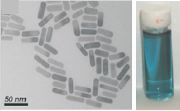 FIGURE 1.2 TEM images of aqueous dispersions of gold nanospheres (a) and nanorods (b) and colors of these dispersions (reproduced from Liz-Marzan L.M., Nanometals: formation and color, Materials Today 2004, 26–31 with permission of Elsevier).