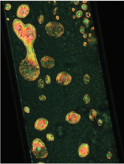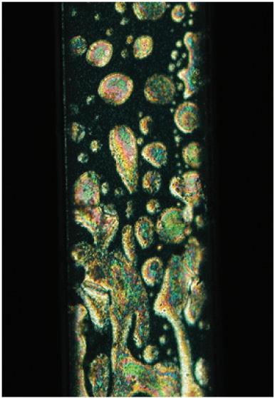 FIGURE 8.13 Images in optical microscopy between cross-polarizing crystals of suspensions of TiO2 rutile particles (mean size 200 × 11 – 15 nm, L/D = 15, pH 2) with volumic fraction ≈ 6% (a), ≈ 10% (b). The colored zones are nematic domains (c) spontaneously formed in the isotropic phase.
