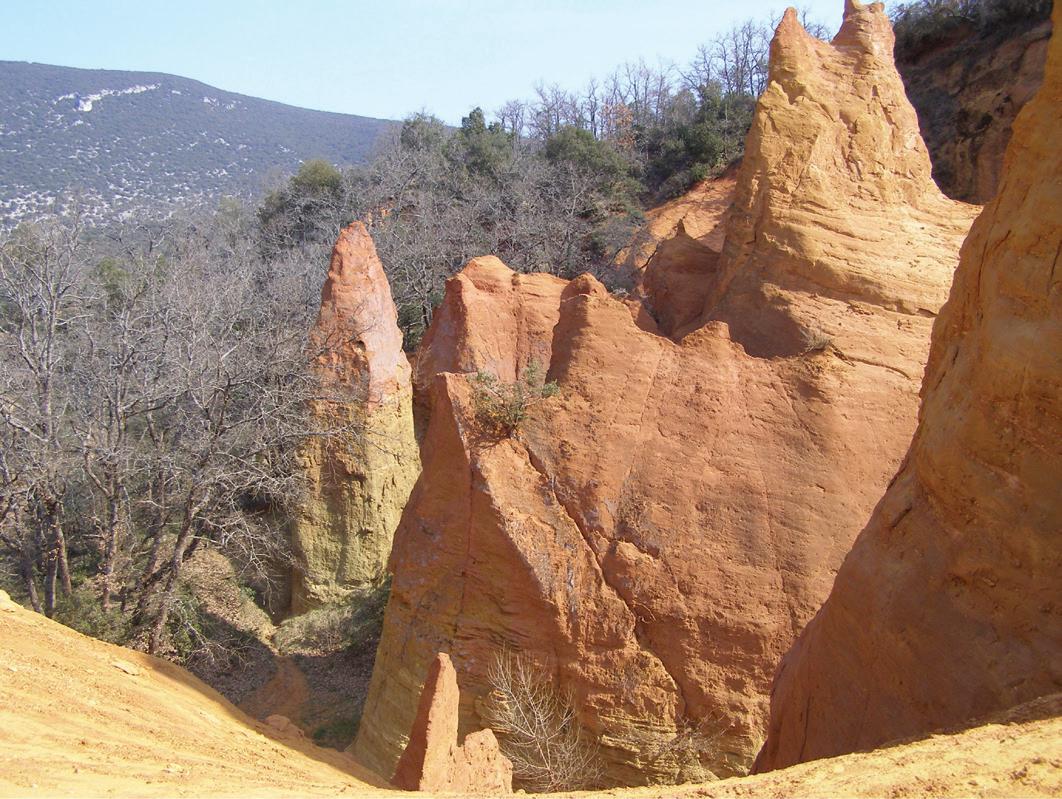 FIGURE 7.1 (a) Landscape of Luberon (southwestern France) showing a deposit of ochre (goethite and hematite).
