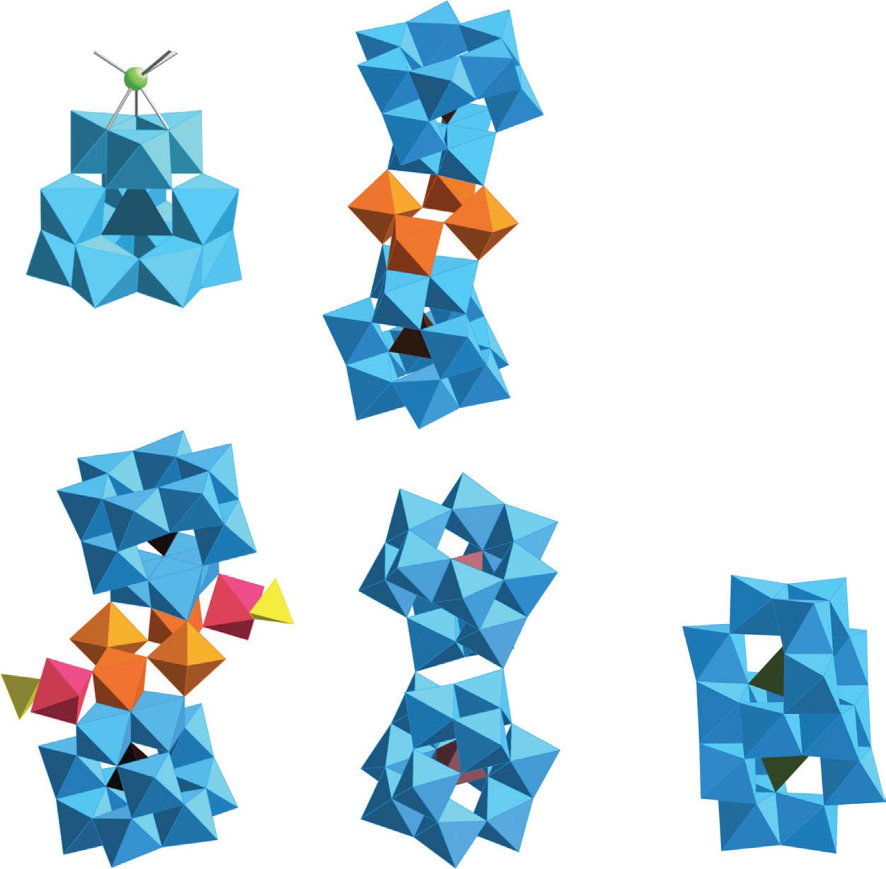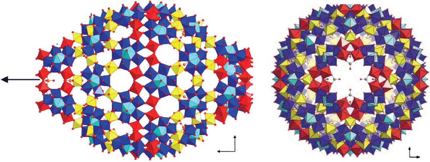 FIGURE 3.39 Schematic view of (Mo176) and (Mo248) (the MoO7 polyhedra are in Turkish blue). View of the cavity in (Mo248) and sketch of the association of the two (Mo36) fragments with (Mo172) (reproduced from [107] with permission of the Nature Publishing Group).
