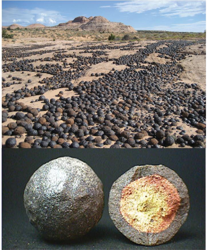 FIGURE 7.12 (a) Coyote Buttes, Paria Wilderness Area, Utah–Arizona border (USA). (b) Overview of moqui marbles in this area (courtesy of M. A. Chan, Univ. of Utah, USA). (c) Cross section of a broken moqui marble (image by Shinishi Kato with permission of rocksandminerals.com).