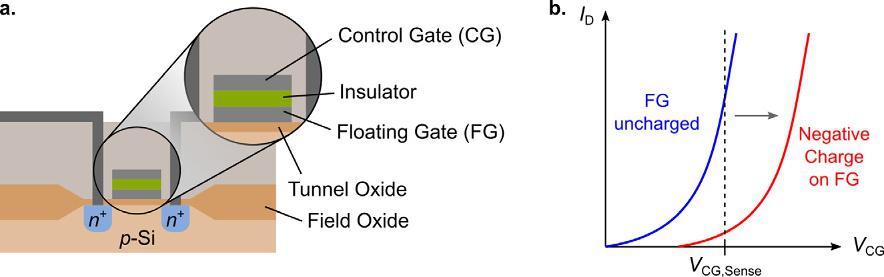 Byapplyingappropriatevoltagesbetweenthecontrolgate(CG),bulk, sourceanddrain,electronsareinjectedfromthechannelintothefloating gate(FG).Thisprocessiscalledprogrammingorwrite-operation.AccumulationofchargeintheFGresultsinashiftofthetransfercharacteristics (Fig.1.3B).Whenasensevoltage VCG ¼ VCG,Sense isappliedtoCGarelativelyloworrelativelyhighdraincurrentisdetecteddependingonthe drain-source-voltage VDS andthechargeonthefloating-gate.Thatallows toencodeatleasttwodifferentlogicstates,0and1,respectively.