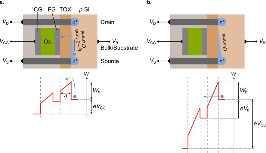 (TOX)withthickness a (intheorderofsomenanometer)formsanenergy barrier(Wb 2 4eV)betweentheFGandchannel/substrate.Forhotelectroninjection,electronsinthechannelbetweensourceanddrain areacceleratedbyapplyingasufficientlyhighdrain-source-voltage VDS ¼ VD – VS.Thehot-carrierinjectioncurrentdensity J canbecalculated bythebarrier-dependentcurrentdensity J0 andinjectionprobability P: