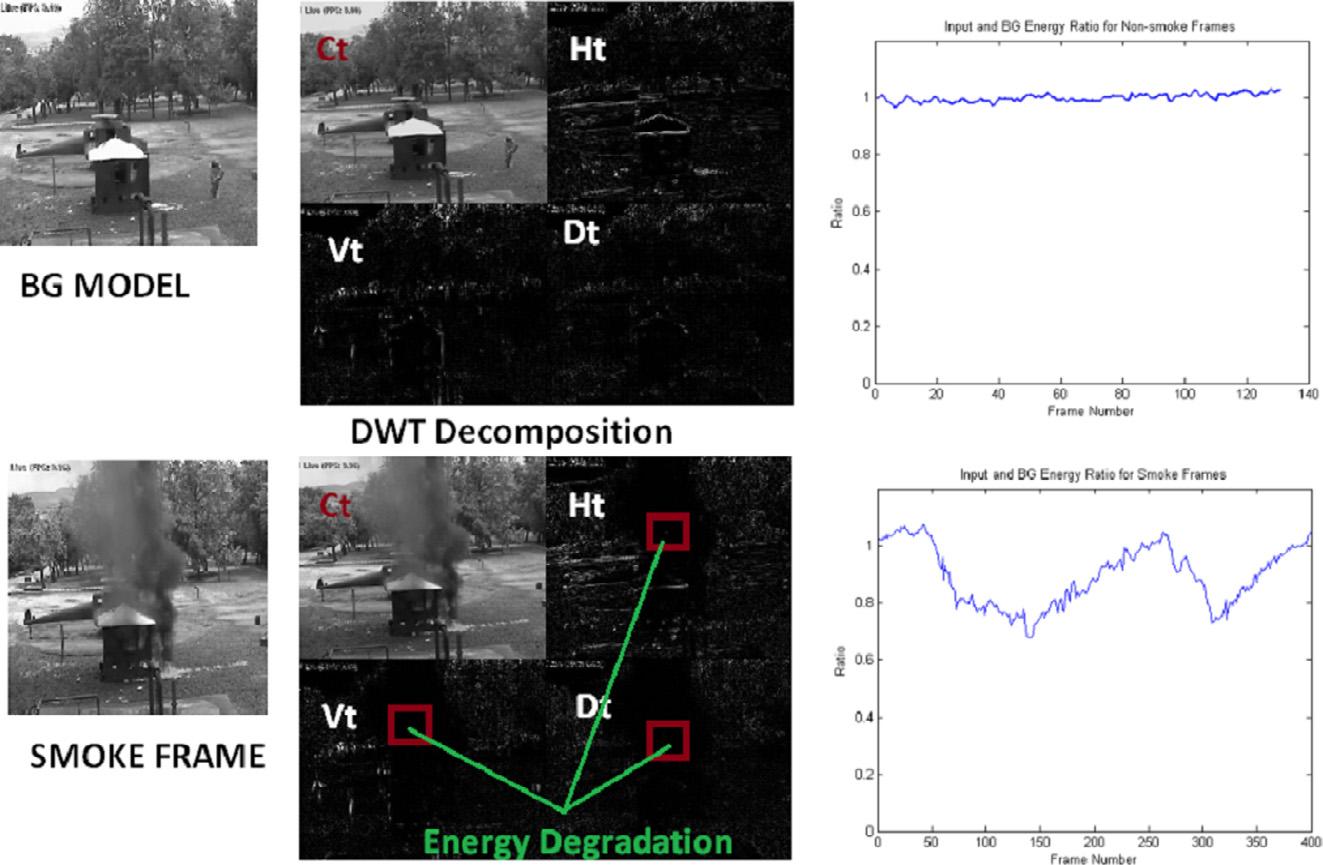 Figure2.3 DWT-basedvideosmokedetection:Whenthereissmoke,theratiobetween theinputframewaveletenergyandtheBGwaveletenergydecreasesandshowsahigh degreeofdisorder.
