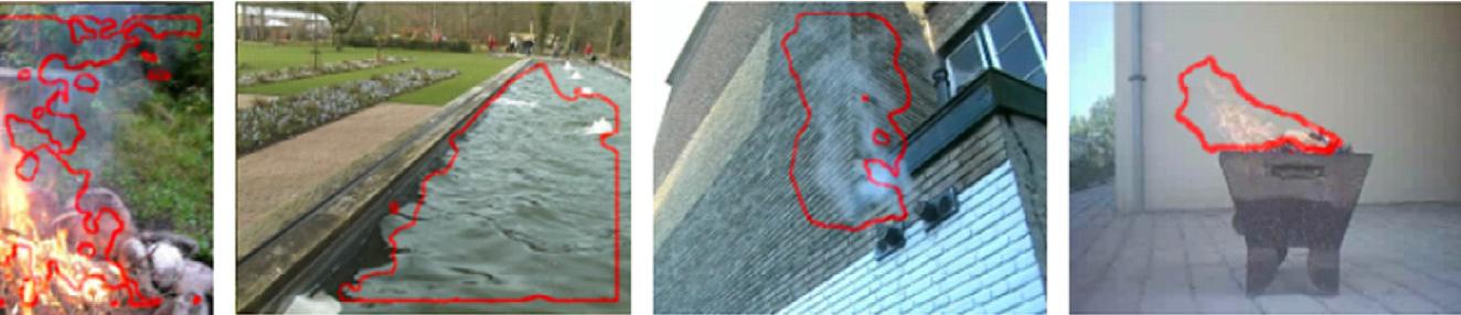 In Fig2.5,dynamictexturedetectionandsegmentationexamplesare shown,usingvideoclipsfromtheDynTexdynamictextureandBilkentdatabases[51,52,50,47].Contoursofdynamictextureregions(eg,fire,water,and steam)areshowninthisfigure.Dynamicregionsinvideoseemtobesegmentedverywell.However,duetothehighcomputationalcost,thesegeneraltechniquesarenotusedinpracticalfiredetectionalgorithmswhichshould runonlow-costcomputers,FPGAs,ordigitalsignalprocessors.Iffuture developmentsincomputersandgraphicsacceleratorscouldlowerthecomputationalcost,dynamictexturedetectionmethodsmaybeincorporatedinto thecurrentlyavailableVFDsystemstoachievemorereliablesystems.