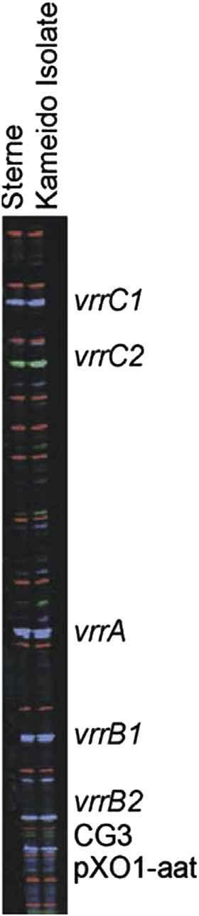 FIGURE1.3 Multiple-locus,variable-numbertandem repeatanalysisofaKameidoisolateandtheSternestrainof Bacillusanthracis (Takahashietal.,2004).