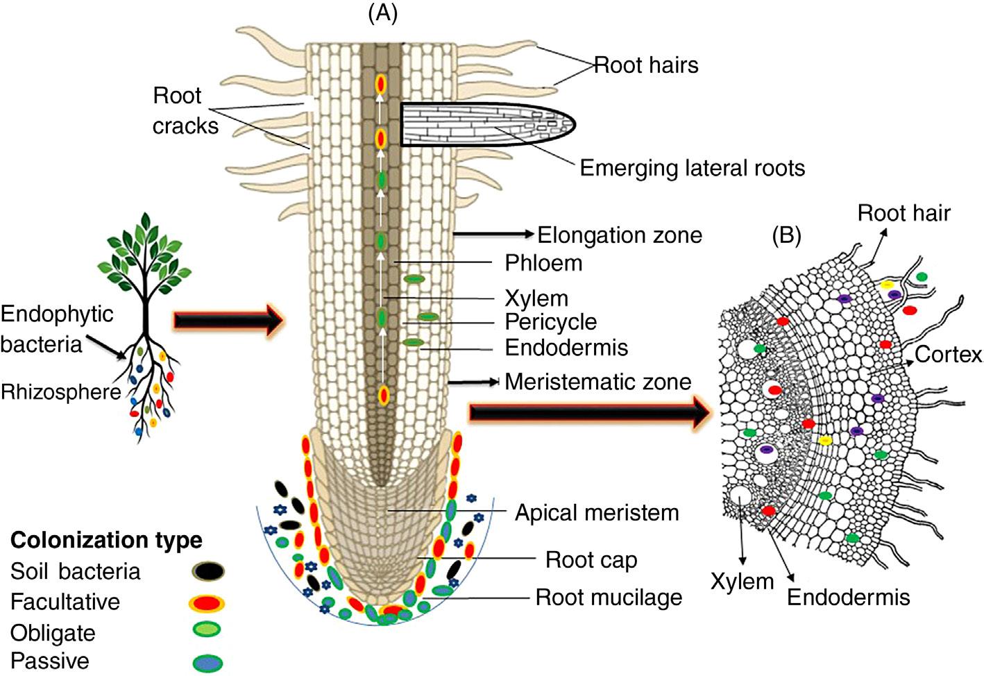 Successful colonization of endophyte involves compatible plant–microbe interactions. As the endophyte invades the host surface, it is recognized by the plant and crosstalk of signaling molecules is initiated (Rosenblueth and Martínez-Romero, 2006; Compant et al., 2010; Brader et al., 2014). The colonization of endophytic microbes depends upon various factors including microbial strains, host genotype, biotic and abiotic factors, nutrients limitation, UV light, etc. and most importantly, the strains better adapted to these factors are comparatively more efficient in getting entry into the plant tissues via various routes like natural opening such as hydathodes, stomata, etc., followed by colonization of host tissue (Hallmann, 2001; Hardoim et al., 2015). To date, numerous reports have presented the details regarding the colonization routes of endophytic microbial strains. In a study, Álvarez et al. (2010) reported the colonization pattern of Ralstonia solanacearum strain and concluded that strains firstly attached to surface followed by invasion of the extension of roots such as root hairs, root tips, lateral roots; however, they may also prefer to enter through mechanical binding during initial colonization. After entering the host tissues, strain may spread themselves upwardly in the plants via xylem vessels. In another study, Compant et al. (2005, 2008) studied the colonization route of strain Paraburkholderia phytofirmans PsJN and reported that endophytic strain entered through the exodermis layer of roots following cortical cells and crossed the barrier of endodermal layer leading to its access to the central zone. From this zone, the endophyte spread toward the upper part of plants through xylem vessels. At the site of xylem colonization, very few bacterial strains are able to cross the endodermal layer. Generally, the endophytic strains prefer unsuberized endodermal cells of the apical root zone to get entry inside host tissues (James et al., 2002; Roncato-Maccari et al., 2003; Compant et al., 2005; Gasser et al., 2011). Studies have demonstrated low concentrations of nutrients in the xylem tissues or plant sap that could be sufficient for the growth of endophytic bacteria (Madore and Webb, 1981; Sattelmacher, 2001; Bacon and Hinton, 2007). At the site of