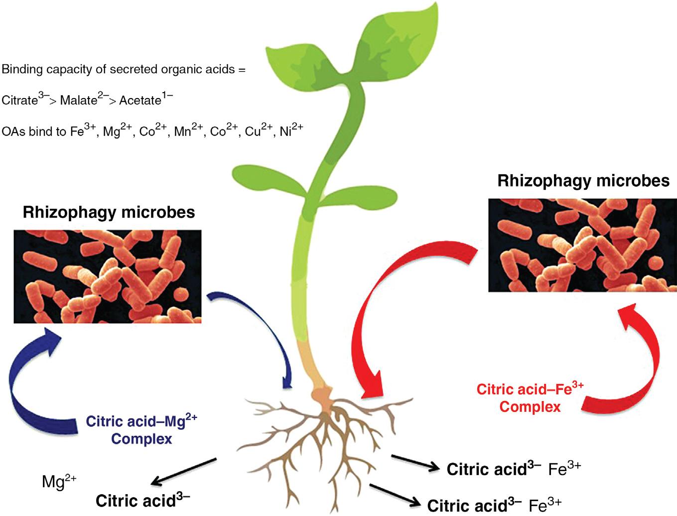 (White et al., 2018). In the rhizophagy cycle, plants attract soil microbes to the root tip meristem with root exudates, and then internalize microbes into root meristem cells, which have soft cell walls. The precise mechanism by which microbes are internalized into root meristem cells remains unknown but may involve previously discussed processes. After internalization microbes become situated in the periplasmic space (between cell wall and plasma membrane) of root cells. The root cell plasma membrane secretes superoxide (produced on membrane bound NADPH oxidases) onto microbes and this strips the cell walls from microbes, resulting in formation of microbe protoplasts (White et al., 2018). Superoxide causes microbe protoplasts to become porous and leak nutrients that are absorbed by root cells. Through the action of cyclosis (cytoplasm rotation or streaming) in root cells, microbe protoplasts are circulated around the periphery of root cells and broken into many smaller protoplasts, rapidly replicating the intracellular microbes. Intracellular microbes in root cells accumulate in the tips of root hairs and trigger root hair elongation by an as yet unknown mechanism; without microbes root hair elongation does not occur (Verma et al., 2017). Microbe protoplasts are ejected into the soil through pores that form in the elastic wall at tips of elongating root hairs after a wave of vacuolar expansion propagates from the base of the root hair to the tip. It is unknown what triggers the periodic ejection of microbes from root hairs. Once ejected from root hairs, microbes reform cell walls and move out into the rhizosphere soil to acquire additional nutrients. The rhizophagy cycle appears to occur in all plants that form root hairs, and may be an important mechanism for acquisition of nitrogen and soil micronutrients like iron, zinc, and magnesium (White et al., 2015, 2018). It seems evident that the rhizophagy cycle is a mechanism whereby plants use soil microbes as carriers of difficult to acquire nutrients (Fig. 1.2). Work is still being done to evaluate details of the rhizophagy cycle mechanism and determine its importance to plant growth (Domka et al., 2019).