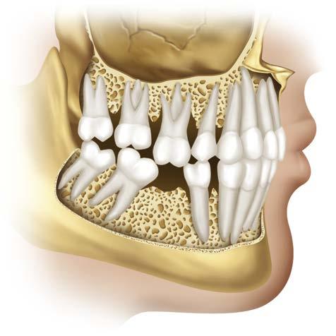 Hard Tissue Loss. Basal bone forms the dental skeletal structure, contains most of the muscle attachments, and begins to form in the fetus before teeth develop (Box 1.1). Alveolar bone first appears when the Hertwig root sheath of the tooth bud evolves (Fig. 1.13). The alveolar bone does not form in the absence of primary or secondary tooth development. The close relationship between the tooth and the alveolar process continues throughout life. Wolff’s law (1892) stated that bone remodels in relationship to the forces applied. Every time the function of bone is modified, a definite change occurs in the internal architecture and external configuration.29,30 In dentistry, the consequences of complete edentulous and remaining bone volume was noted by Misch in 1922, in which he described the skeletal structure of a 90-year-old woman without teeth for several decades.31