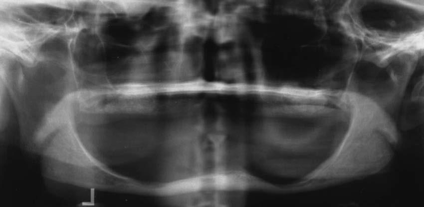 • Fig. 1.20 Panoramic radiograph exhibiting extensive mandibular posterior atrophy. Note that the anterior teeth have maintained the bone in the anterior mandible and has resulted in the degradation of the premaxilla (Combination Syndrome). Wearing of a mandibular class I removable partial denture has escalated the posterior bone loss.
