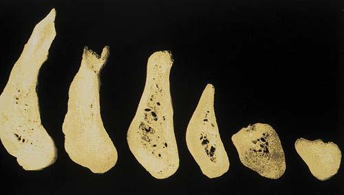 • Fig. 1.15 Atwood described six different stages of resorption in the anterior mandible. Stage 1 represents the tooth and surrounding alveolar process and basal bone. Stages II and III illustrate the initial residual ridge after tooth loss. Stages IV to VI primarily describe a continuous loss in length of anterior residual bone.