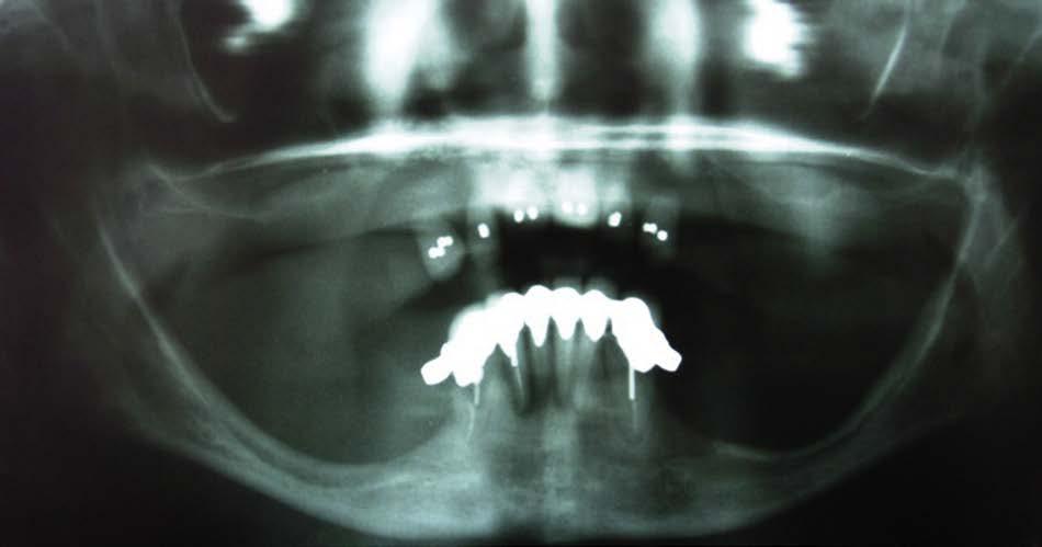 Loss of bone in the maxilla or mandible is not limited to alveolar bone; portions of the basal bone also may be resorbed, especially in the posterior aspect of the mandible in which severe resorption may result in catastrophic bone loss.35 The contents of the mandibular canal or mental foramen eventually become dehiscent and serve as part of the support area of the prosthesis. As a result, acute pain and transient to permanent nerve impairment of the areas supplied by the mandibular nerve are possible. The body of the mandible is also at increased risk of pathologic fracture, even under very low impact forces. The mandibular fracture causes the jaw to shift to one side and makes stabilization and an esthetic result most difficult to obtain during treatment of the fracture.