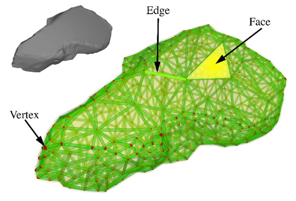 Figure1.1. Definitionofasphero-polyhedronillustratedinthecaseofa non-convexpebble.Thevextexesarespheres,theedgesarecylinders andthefacesarethick3Dpolygons(trianglesinthispicture)