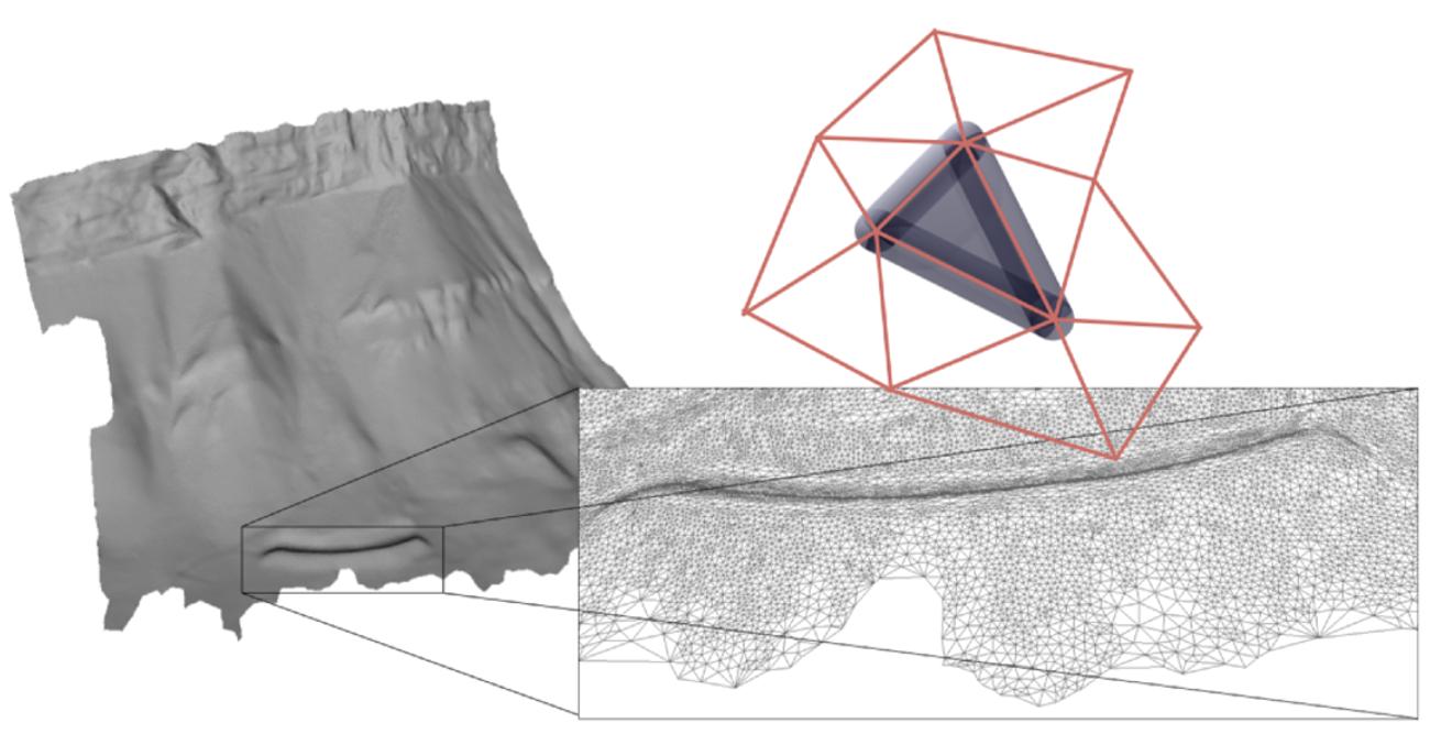 Thetopologyoftheterraincanbeassessedbymeansofdifferent techniques(aerialLIDARscans,stereocorrelationofphotographic images,etc.).Suchascanoftheterraingenerallyresults,aftersome postprocessing,inatriangularmeshformingthe digitalsurfacemodel (DSM)oftheterrain.Fromthepointofviewof DEMbox model,each triangleisaspherotrianglehavingallitsdegreesoffreedomblocked. AlltheadvantagesofSPstillexistforboththeterraintopologyandits interactionswiththemovingblocks.However,thequestionofthe sensitivitytothesizeresolution(relatedsomehowtothebumpynessof theterrain)remains,eveniftheuseofMinkowskiradiismoothsthe surface.