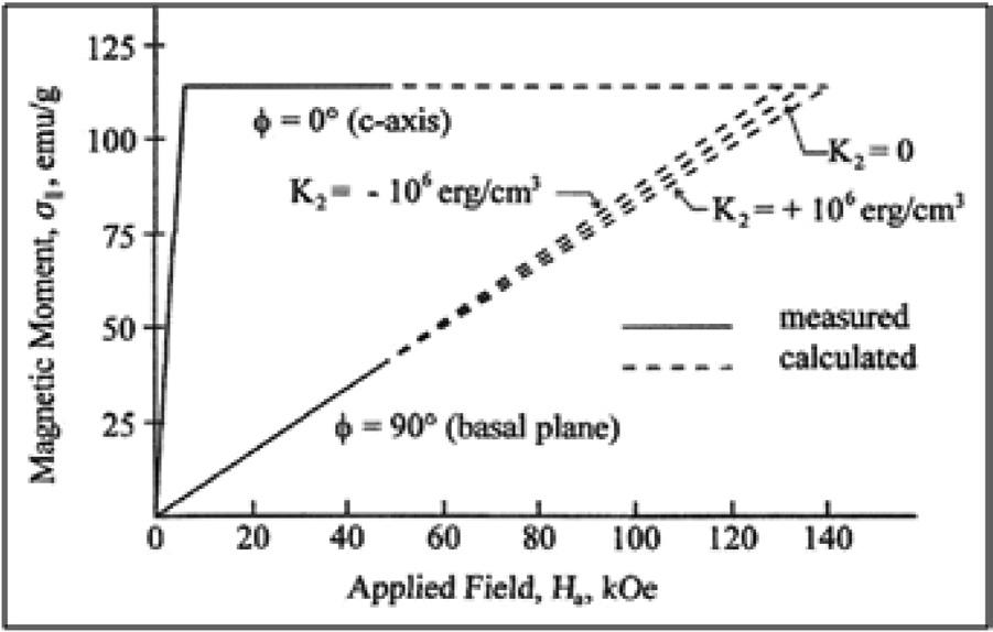 It is generally agreed that the history of rare earth-transition metal permanent magnets began with the discovery by Karl Strnat in 1967 of the extremely large magnetocrystalline anisotropy of ~ 130 kOe (10,345 kA/m) for YCo5 (Hoffer and Strnat 1966; Strnat, Hoffer and Ray 1966). This work was carried out at the Wright Patterson Air Force Base in Dayton, Ohio and their experimental results on a single crystal of YCo5 are shown in Fig. 1.6. Because the highest field that they had available was 45 kOe,