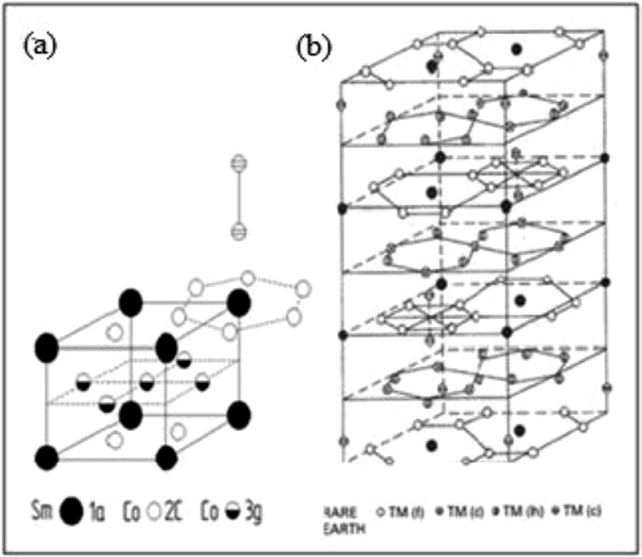 Fig. 1.7 (a) Hexagonal unit cell of the SmCo5 intermetallic phase (adapted from Kirchmeyer and Burzo 1990). (b) Rhombohedral unit cell of the Th2Zn17 structure (Herbst et al., 1982).