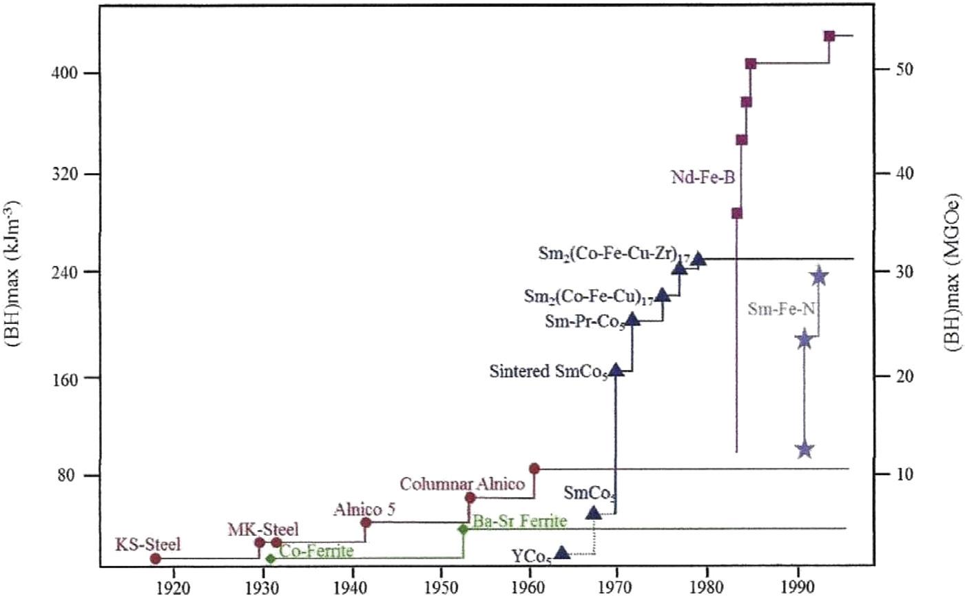 The increasing use and importance of permanent magnets has been driven largely by a significant increase in magnetic properties. This is shown in Fig. 1.1, which displays the chronological development of the various families of permanent magnets over time and presents a very graphic picture of the evolution that has occurred in permanent magnets in the last century. This chronology is expressed in terms of maximum energy product (BH)max, which is the figure of merit most frequently used to