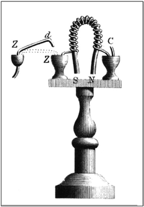 These early discoveries eventually led to the invention of the electromagnet by the Englishman William Sturgeon in 1824. The invention of the electromagnet was one of the most important developments in the history of magnetism because it led to the development of the first important electromechanical devices, including the first practical electric motors. A rendering of Sturgeon’s first electromagnet from a paper that he gave to the Royal Society in London in 1824 is shown in Fig. 1.3. Sturgeon activated the electromagnet by turning on the current from a batter through a switch which consisted of a small cup of liquid mercury. We see again how important the development of the battery was to the future understanding of electricity. Without the battery to provide a steady current, Sturgeon’s and other experiments involving the study of electricity could not have taken place.