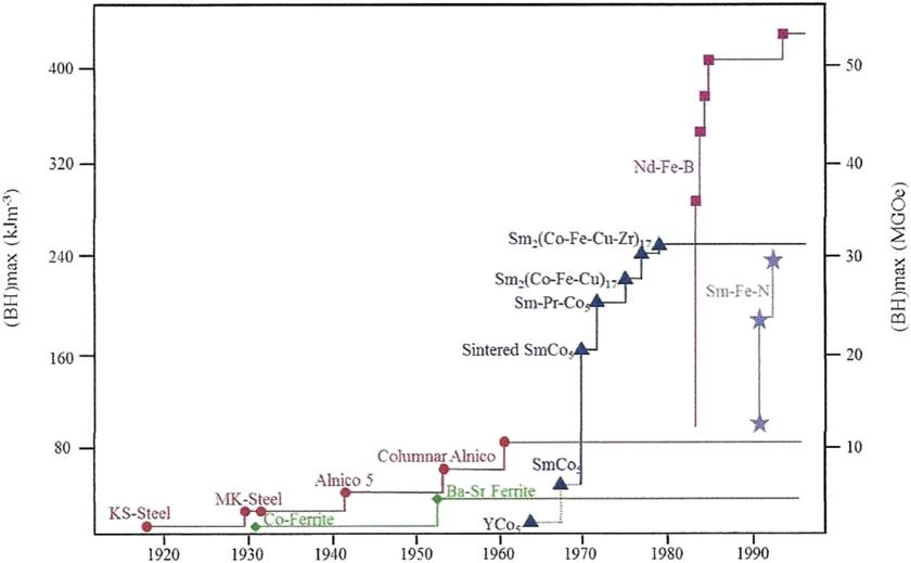 The increasing use and importance of permanent magnets has been driven largely by a significant increase in magnetic properties. This is shown in Fig. 1.1, which displays the chronological development of the various families of permanent magnets over time and presents a very graphic picture of the evolution that has occurred in permanent magnets in the last century. This chronology is expressed in terms of maximum energy product (BH)max, which is the figure of merit most frequently used to rate and compare the various families and grades of magnets. This number is proportional to the energy stored in the magnet and, therefore, the work that can be done by the magnet. As seen in this figure, between about 1917 and 2000 the maximum energy product increased by about fifty times. Over the same time, intrinsic coercivity levels have increased by an almost 100 times, from about 250 Oersted to as high as 25,000 Oersted. The 1950s and 1960s saw the development of sintered ferrite magnets, one of the most important discoveries in the history of permanent magnets. These magnets are still the most commonly used in terms of volume, a testament to their unparalleled economic efficiency and chemical stability. In 2020, an estimated 900,000 tons of sintered ferrite magnets were produced. Another major step in the evolution of permanent magnets was the discovery of Sm-Co magnets in the 1960s and 1970s. The discovery of Sm-Co magnets stimulated a great period of basic research which eventually led to the discovery of NdFeB magnets. As seen in Fig. 1.1, between 1970 and 1990, energy products increased by a factor of 12 compared to those obtained by the best ferrite magnets. The last 50 years has also