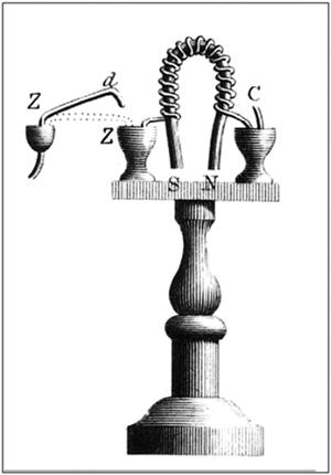 One of the most important events leading to this discovery was the development of the first ba ery by the Italian physicist Alessandra Volta in the year 1800. His-early ba eries consisted of two dissimilar metals immersed in an electrolyte. Although he investigated many different combinations, his best results were obtained using plates of zinc and copper with either a weak sulfuric acid solution or salt brine electrolyte. The importance of the development was that it allowed the production of a continuous electric current for the first time. All previous electricity studies were carried out on static electricity obtained by rubbing an object like amber. In 1820 the Danish physicist Hans Christian Oersted discovered that electricity passing through a conductor produced a magnetic field by observing that the flowing current deflected the needle of a compass. This demonstration would not have been possible without the development of the ba ery by Volta. Later in the same year the French physicists Jean-Baptiste Biot and Felix Savant discovered that a current-carrying wire exerts a magnetic force that is inversely proportional to the distance from the wire. This was a very important discovery because it demonstrated for the first time the