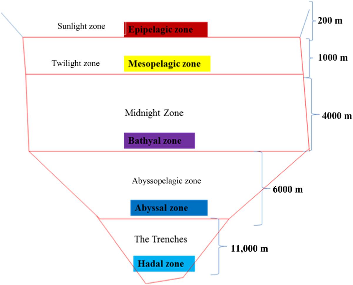 • Oceaniczone theregionbetweencontinentalshelves Theoceaniczoneisfurthersubdividedintofourtypesbasedondepth. Theyareepipelagic(0 200m),mesopelagic(200 1000m),bathypelagic (1000 3800m)andabyssopelagic(greaterthan3800m)zone [2]