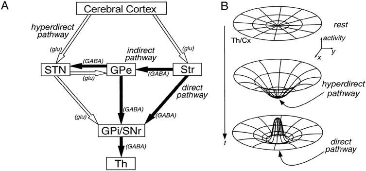 FIGURE1.2 Schematicdiagramofthehyperdirectcortico-subthalamo-pallidal,directcortico-striato-pallidal,and indirectcortico-striato-GPe-subthalamo-GPipathways. Whiteandblackarrows representexcitatoryglutamatergic(glu) andinhibitoryGABAergic(GABA)projections,respectively. GPe,externalsegmentoftheglobuspallidus; GPi,internalsegmentoftheglobuspallidus; SNr,substantianigraparsreticulata; STN,subthalamicnucleus; Str,striatum; Th,thalamus. B:aschematicdiagramexplainingtheactivitychangeovertime(t)inthethalamocorticalprojection (Th/Cx)followingthesequentialinputsthroughthehyperdiectcortico-subthalamo-pallidal(middle)anddirect cortico-striato-pallidal(bottom)pathways. ModifiedfromRef.[44].