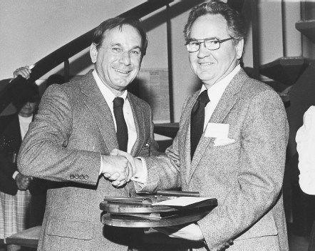 Author David Baskerville (right) receiving ASCAP’s Deems Taylor Award, given each year for outstanding books on music. The presentation is by Academy Award—winning songwriter Hal David, representing ASCAP.