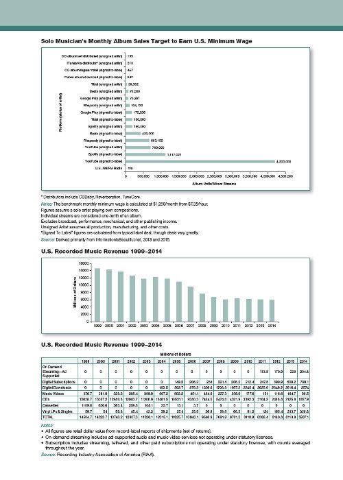 What about the business side of the music business? A straight line between a strong consumer appetite for music and a fat, happy music industry is inarguably less certain than it once was. The early explosive growth of peer-to-peer file sharing in the 1990s, a shift toward nontraditional and online retail, the introduction of single-track downloads rather than full (more expensive) albums, and the acceleration of streaming have all altered the old equation. These new realities have spurred (some would say forced) new ways of thinking about how to connect “making music” with “making money.”